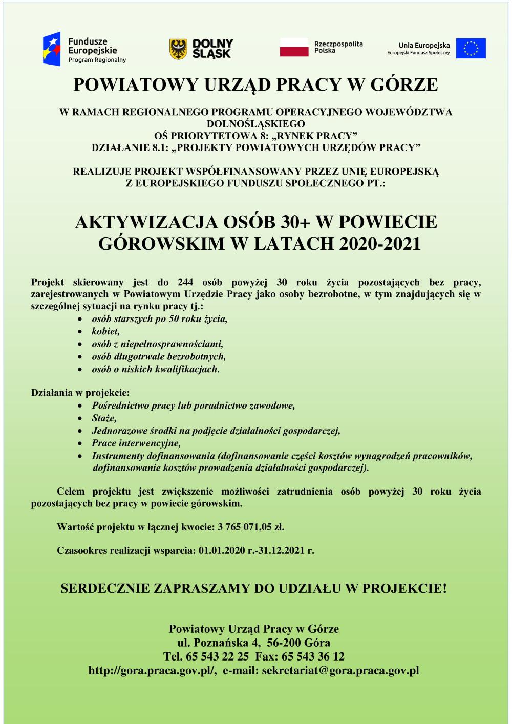 Nabór wniosków na aktywne formy w ramach projektu pn. „Aktywizacja osób 30+ w powiecie górowskim w latach 2020-2021" współfinansowanego przez Unię Europejską ze środków Europejskiego Funduszu Społecznego, w ramach Regionalnego Programu Operacyjnego Województwa Dolnośląskiego 2014-2020, Działanie 8.1 Projekty powiatowych urzędów pracy
