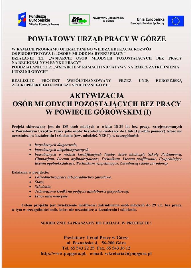 Projekt pt. "Aktywizacja osób młodych pozostających bez pracy w powiecie górowskim (I)" w ramach Poddziałania 1.1.2 PO WER w 2015 roku - Powiatowy Urząd Pracy w Górze