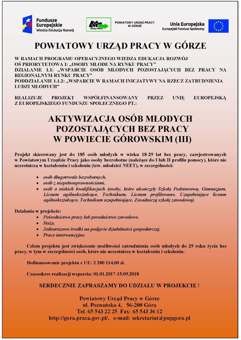 Projekt pt. "Aktywizacja osób młodych pozostających bez pracy w powiecie górowskim (III)" w ramach Poddziałania 1.1.2 PO WER w 2017 roku - Powiatowy Urząd Pracy w Górze