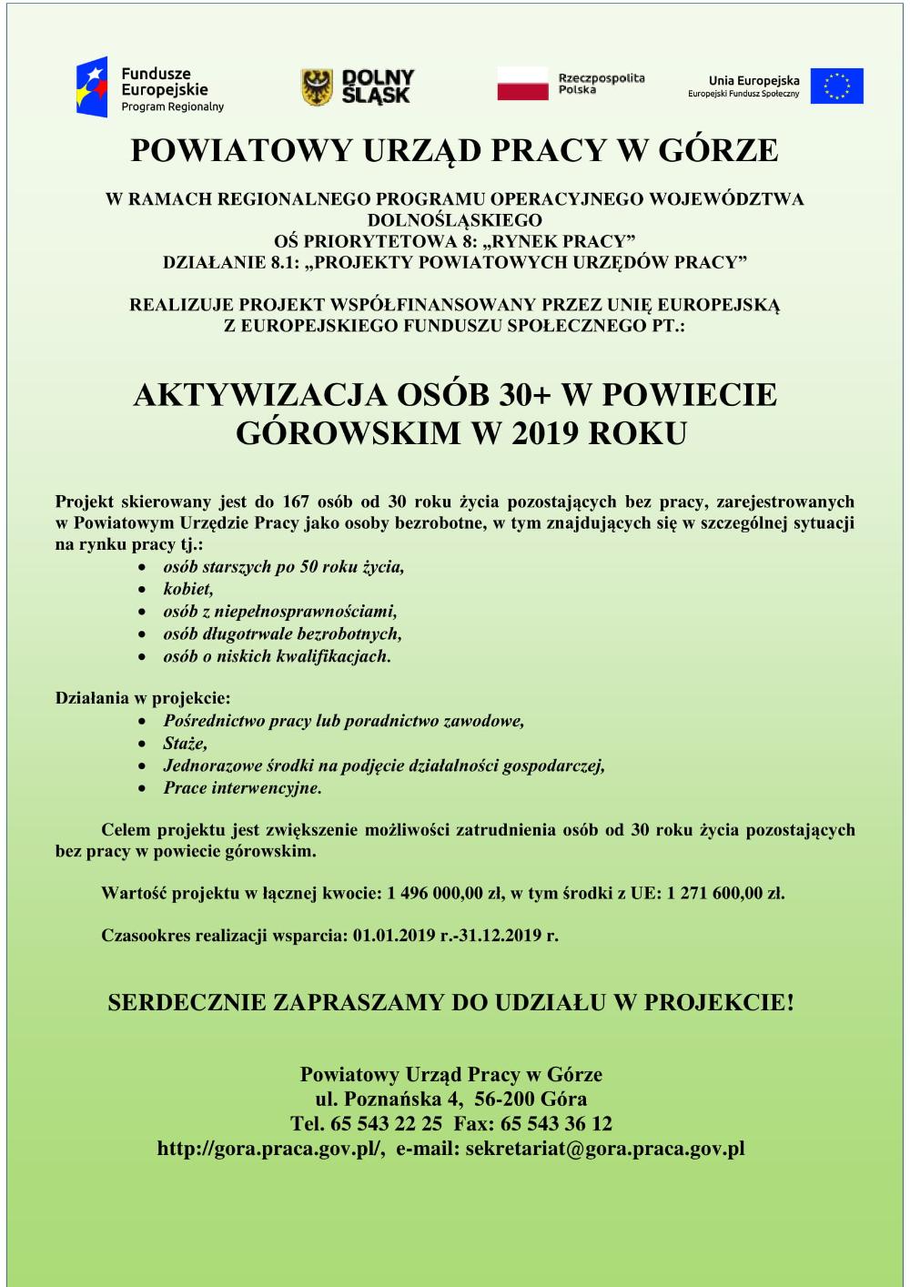 Nabór wniosków na aktywne formy w ramach projektu pn. „Aktywizacja osób 30+ w powiecie górowskim w 2019 roku" współfinansowanego przez Unię Europejską ze środków Europejskiego Funduszu Społecznego, w ramach Regionalnego Programu Operacyjnego Województwa Dolnośląskiego 2014-2020, Działanie 8.1 Projekty powiatowych urzędów pracy