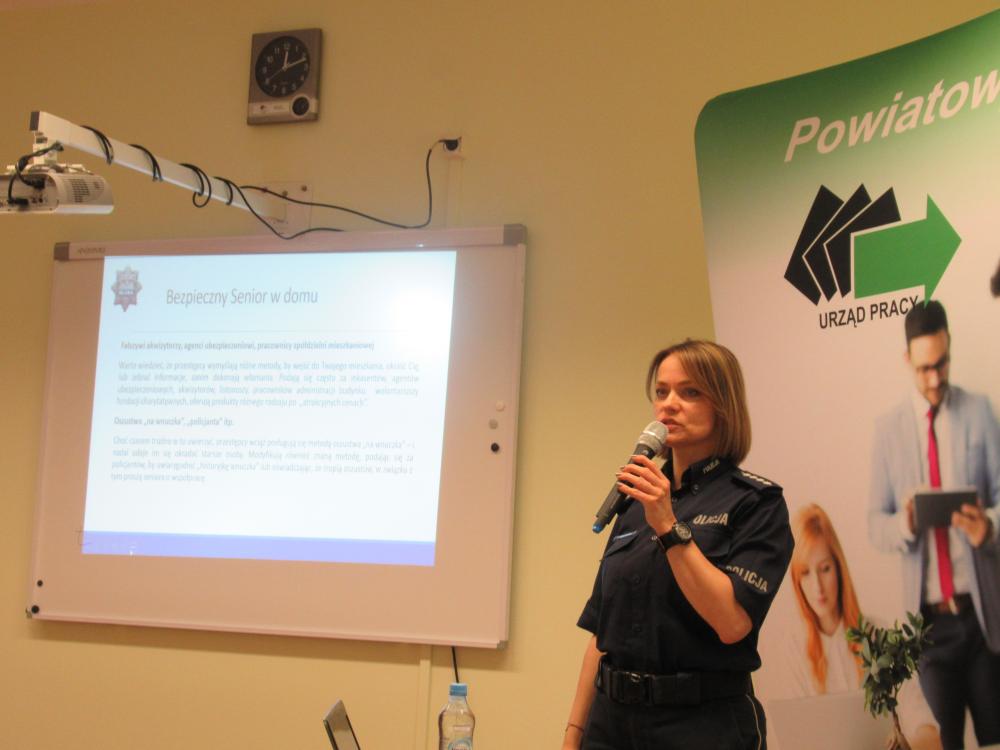 Przedstawicielka Policji w Mławie asp. sztab. Pani Anna Pawłowska poruszyła ważne zagadnienia związane z bezpieczeństwem seniorów. Zaprezentowała sposoby, jakimi posługują się oszuści, a szczególną uwagę zwróciła na cyberprzestępczość.