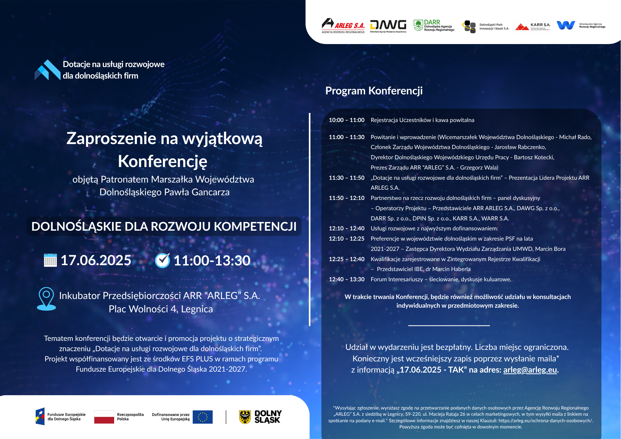 Agencja Rozwoju Regionalnego „ARLEG” S.A. zaprasza na konferencję pn. „DOLNOŚLĄSKIE DLA ROZWOJU KOMPETENCJI” dotyczącą otwarcia i promocji projektu o znaczeniu strategicznym pn. „Dotacje na usługi rozwojowe dla dolnośląskich firm”. Projekt współfinansowany jest ze środków EFS PLUS w ramach programu Fundusze Europejskie dla Dolnego Śląska 2021-2027 ma na celu wzrost konkurencyjności dolnośląskich przedsiębiorstw poprzez usługi realizowane w ramach BUR pozwalające na rozwój przedsiębiorstwa i/lub jego pracowników, w szczególności nabycie lub potwierdzenie kwalifikacji, usprawnienie procesów lub obszaru działania przedsiębiorstwa, częściową lub całkowitą zmianę profilu działalności gospodarczej. W projekcie zaplanowano, że 12 857 pracowników uzyska kwalifikacje w wyniku uczestnictwa w usłudze rozwojowej.